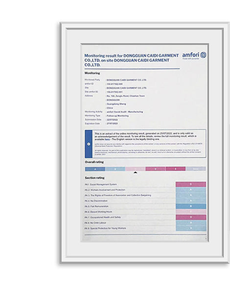 Our BSCI has passed the B grade verification, which belongs to the leading apparel industry.
